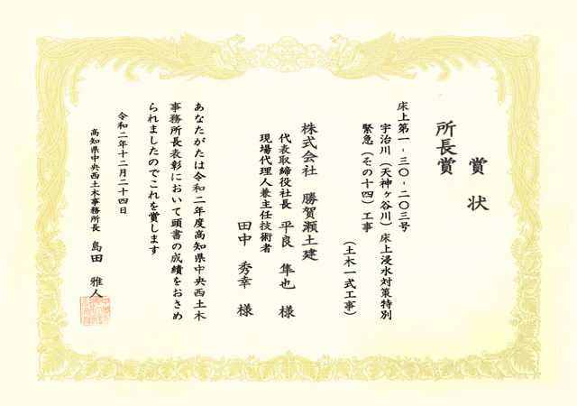令和2年度高知県中央西土木事務所長表彰